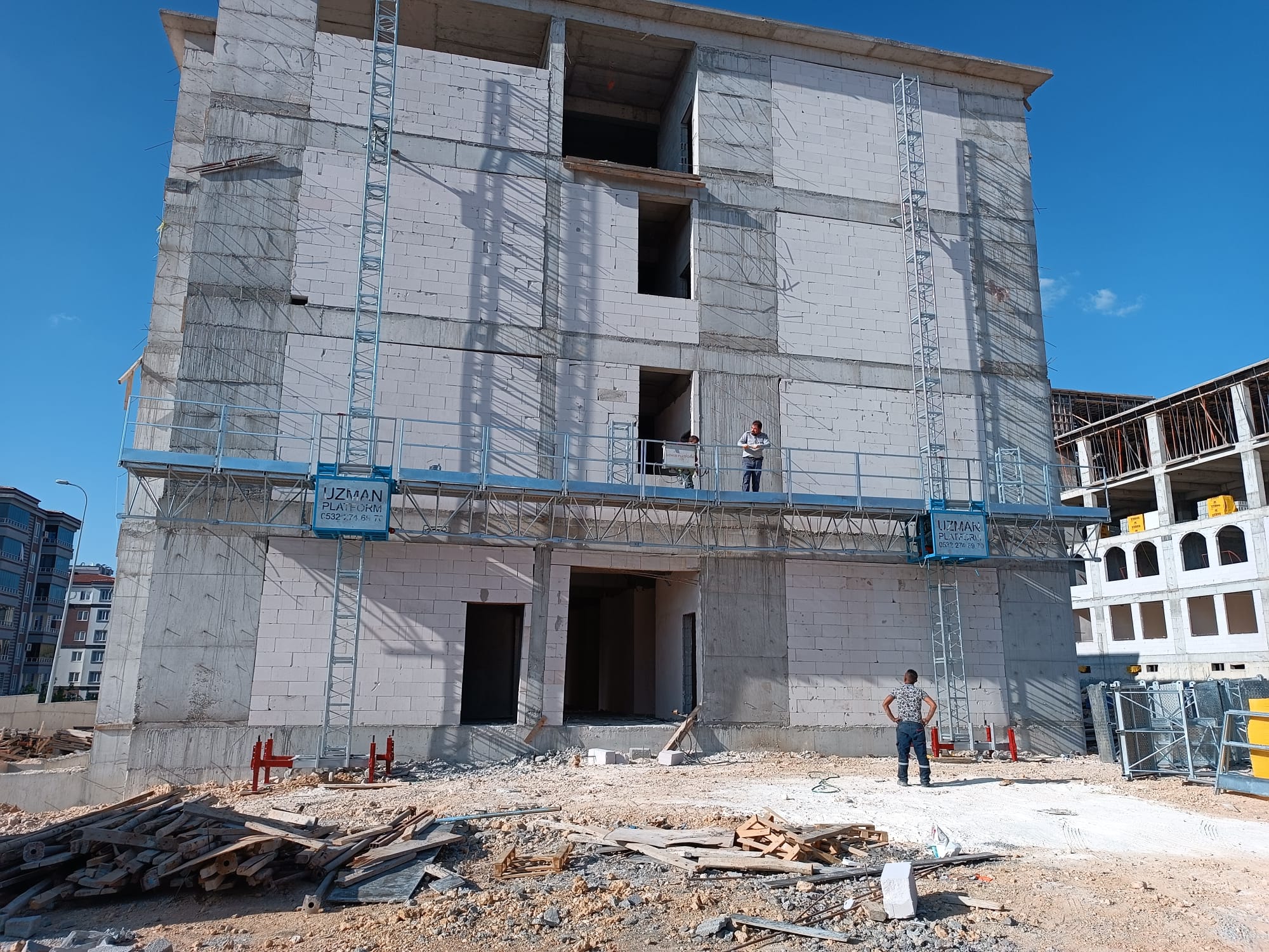 Uzman Tekin Makine çift kolonlu platform 30 metre platform uzunluğuna ve 150 metre yüksekliğine kadar ankrajla kullanılabilir. 150 metre üzerindeki yükseklikler için özel ankraj sistemleri kullanılır.